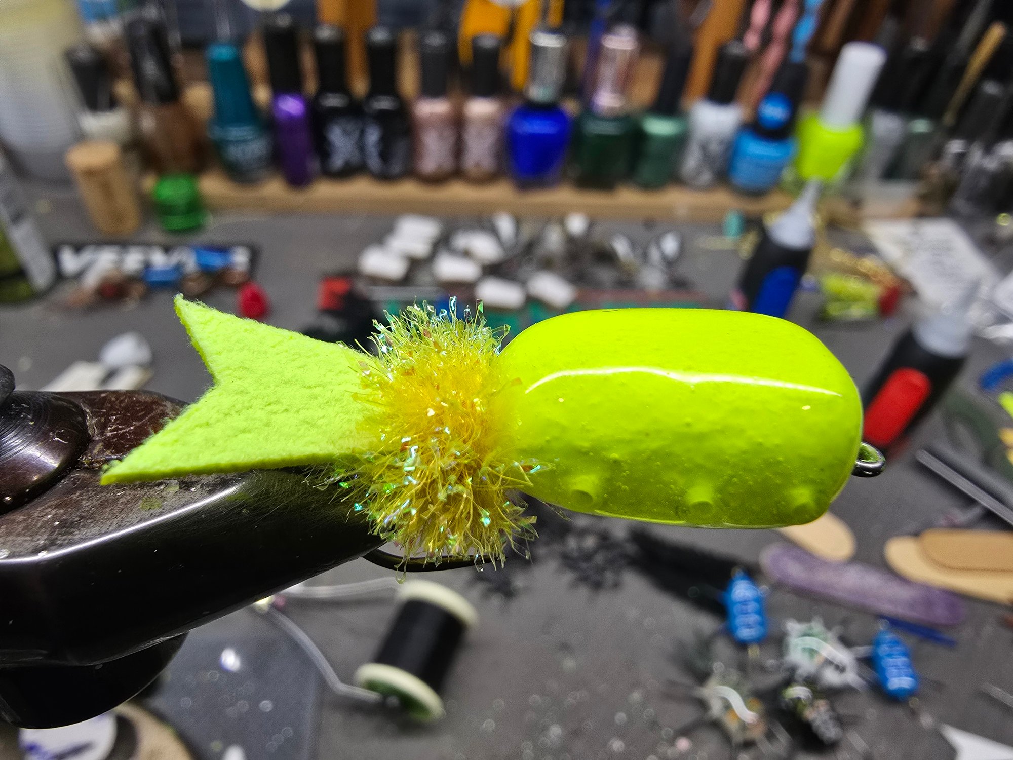 This is some magic stuff. Coat your dumbbell eyes, popper bodies, wing casings and more. We use it often to stiffen up popper and damsel tails on Topwater Bugs. Mix in even ratios with water to thin it down. Cleans up with water. Puts a crystal clear protective coating on anything you want.