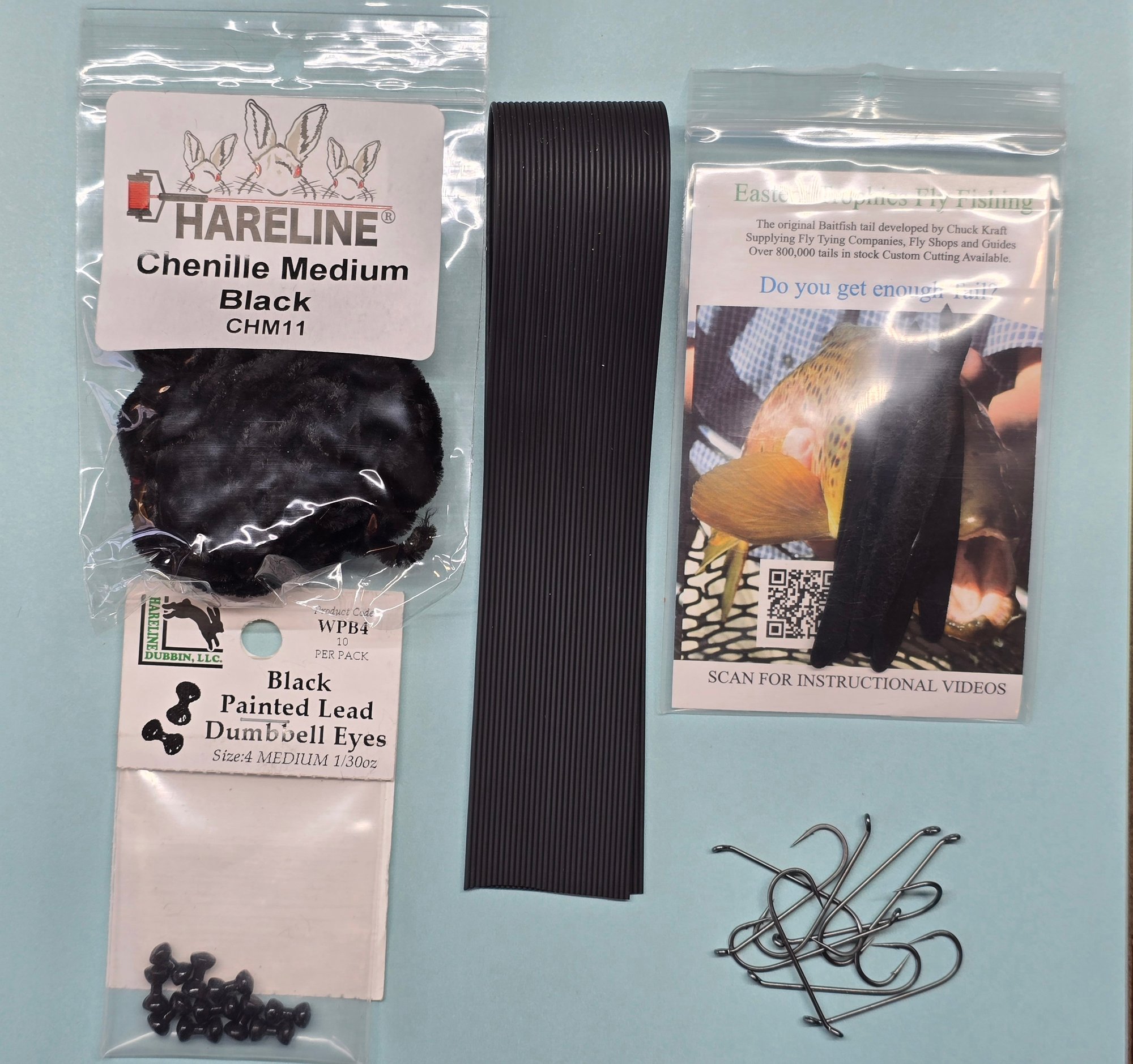Available in the most productive colors. Each kit contains Ten Ned Tails, Medium Round Rubber Legs, Chenille, Ten #4 R74 Hooks and Ten Dumbbell eyes.
